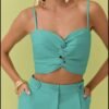 Recorte estratégico abaixo do busto, deixando o look moderno e sofisticado. Short de cintura alta, com modelagem de alfaiataria, bolsos laterais e botões decorativos que elevam o acabamento.