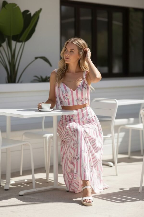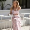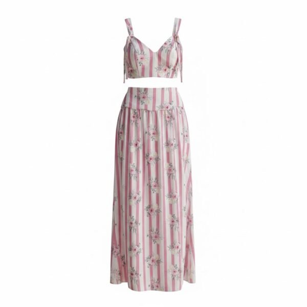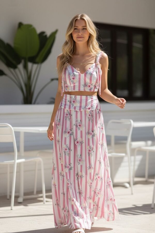 Esse conjunto traz uma proposta super feminina e delicada. Ele é composto por cropped de alças finas com decote levemente em V e detalhe de amarração nos ombros, que dá um charme extra e um toque romântico. A modelagem valoriza o colo e deixa o visual leve e fresco. A saia longa fluida complementa perfeitamente o cropped, criando um efeito elegante e alongado na silhueta. O caimento é soltinho, trazendo movimento e sofisticação ao caminhar. A estampa é o grande destaque: Floral delicado.