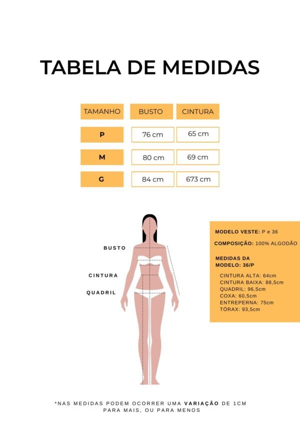 M– Cintura 70cm | Quadril 100cm | Busto 84cm | Comprimento 99cm | Entreperna 71cm