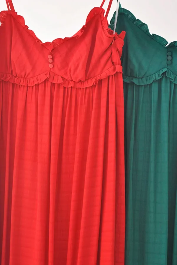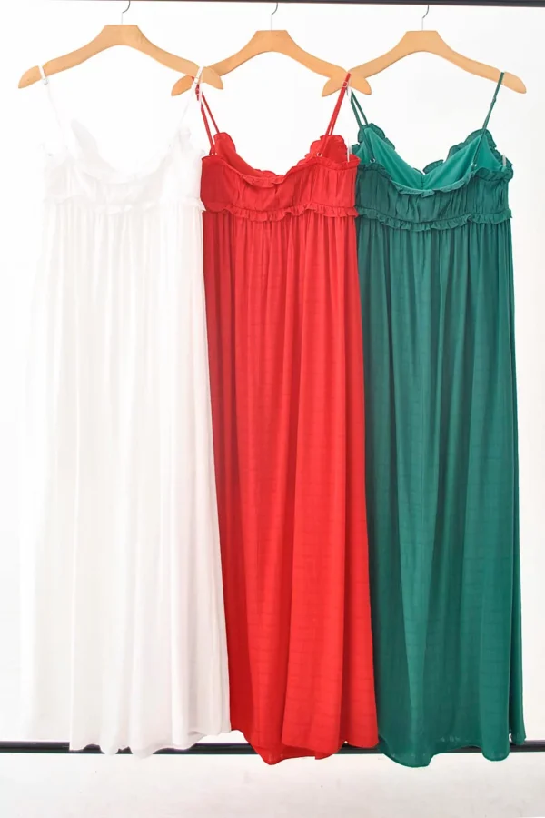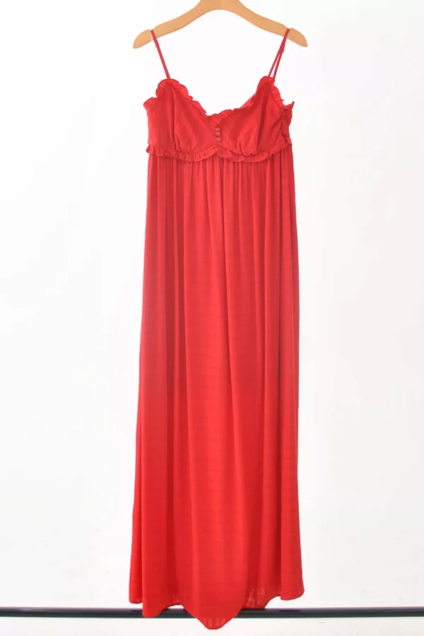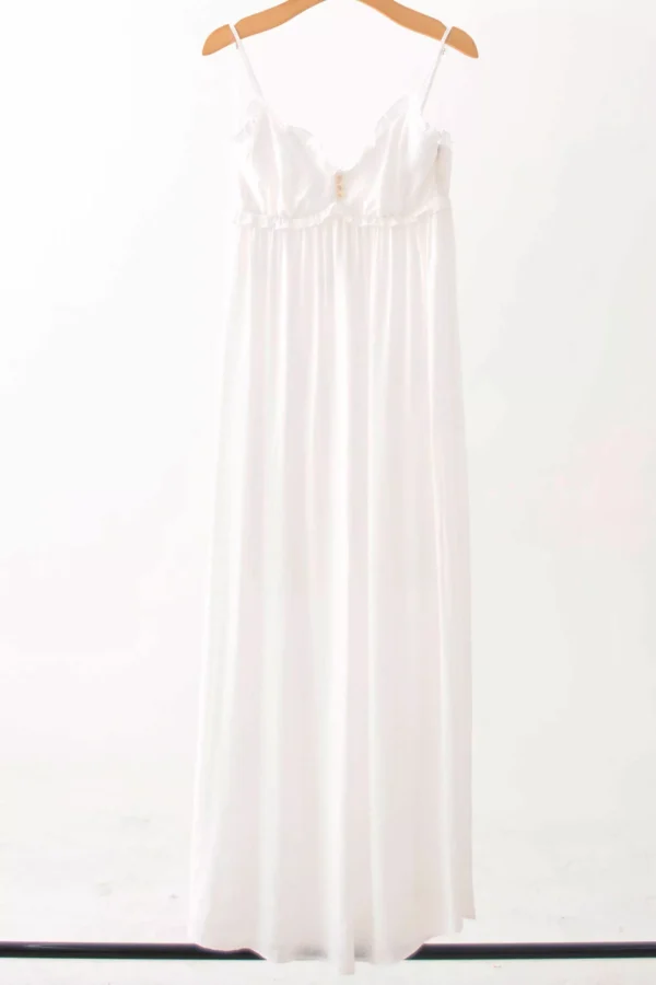 Esse vestido longo é puro charme e elegância. Confeccionado em tecido leve e fluido, ele tem caimento solto que traz movimento e conforto, ideal para dias quentes. O destaque fica por conta do decote delicado com acabamento ondulado e da amarração abaixo do busto, que valoriza a silhueta de forma natural e feminina.