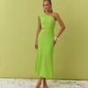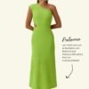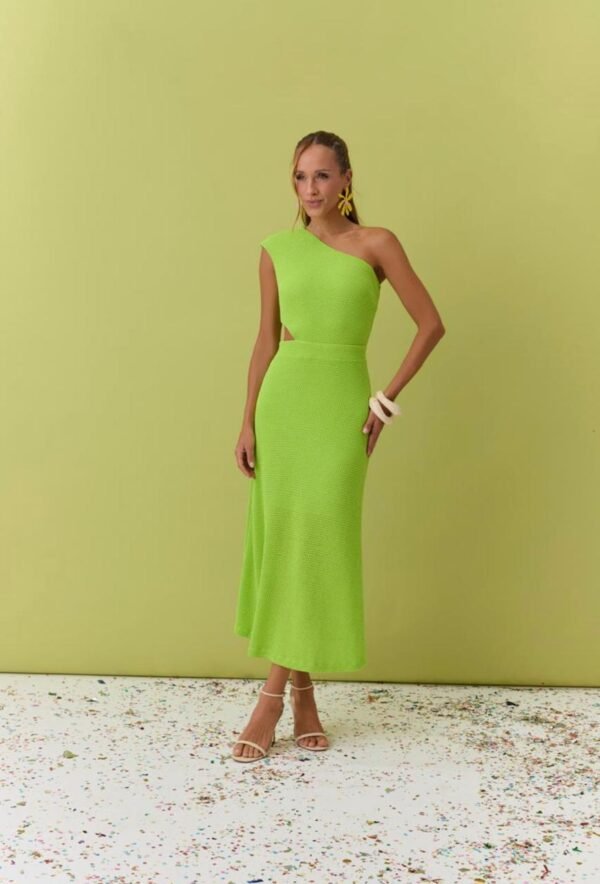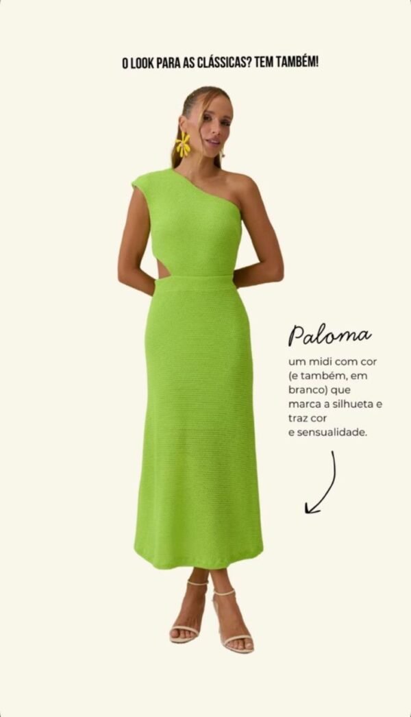 Vestido midi Paloma de ombro único, possui recorte na altura da cintura. Fechamento em zíper na lateral.